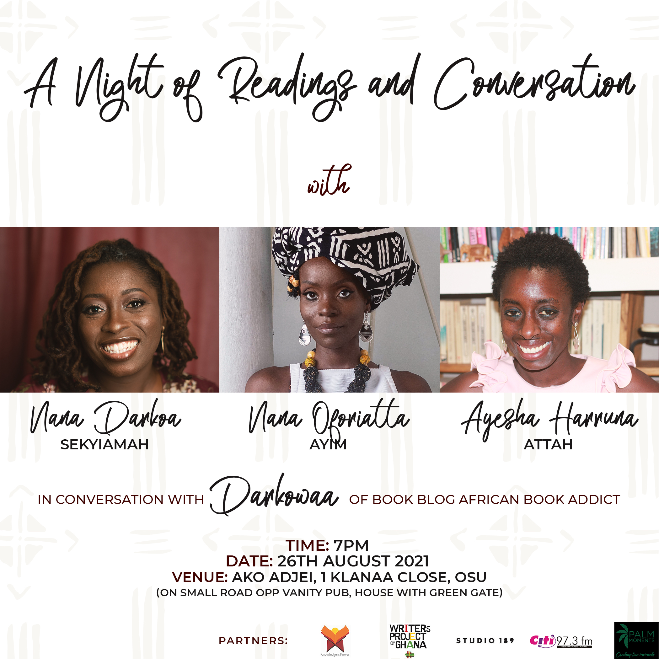 In August, I had the privilege of moderating a wonderful reading event with three brilliant Ghanaian women writers – Nana Darkoa Sekyiamah, Nana Oforiatta Ayim and Ayesha Harruna Attah. It was a dream come true to be in the midst of Ghanaian women writers that I admire and have loudly celebrated on this platform (via #ReadGhanaian) since 2017. The event was held at Studio 189 in Osu, with an audience of about 50 people in total. The venue was cute and the event was pretty rich and vibrant.